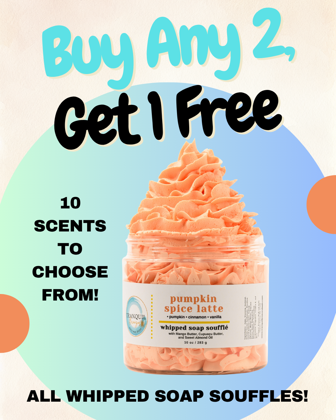Transform your daily cleansing ritual into a spa-like experience with our Whipped Soap Souffles. Bonus offer: buy any 2, get 1 free!